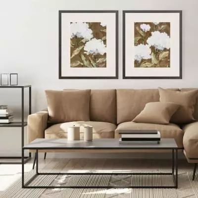 Gorgeous flower blossoms dramatically contrast with a milk chocolate background. Neutrally matted and framed in a dark espresso wood finish moulding.