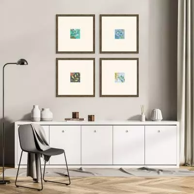 A colorful petite botanical series features extra-wide white matting. Framed in a ribbed moulding in a distressed antique gold finish.