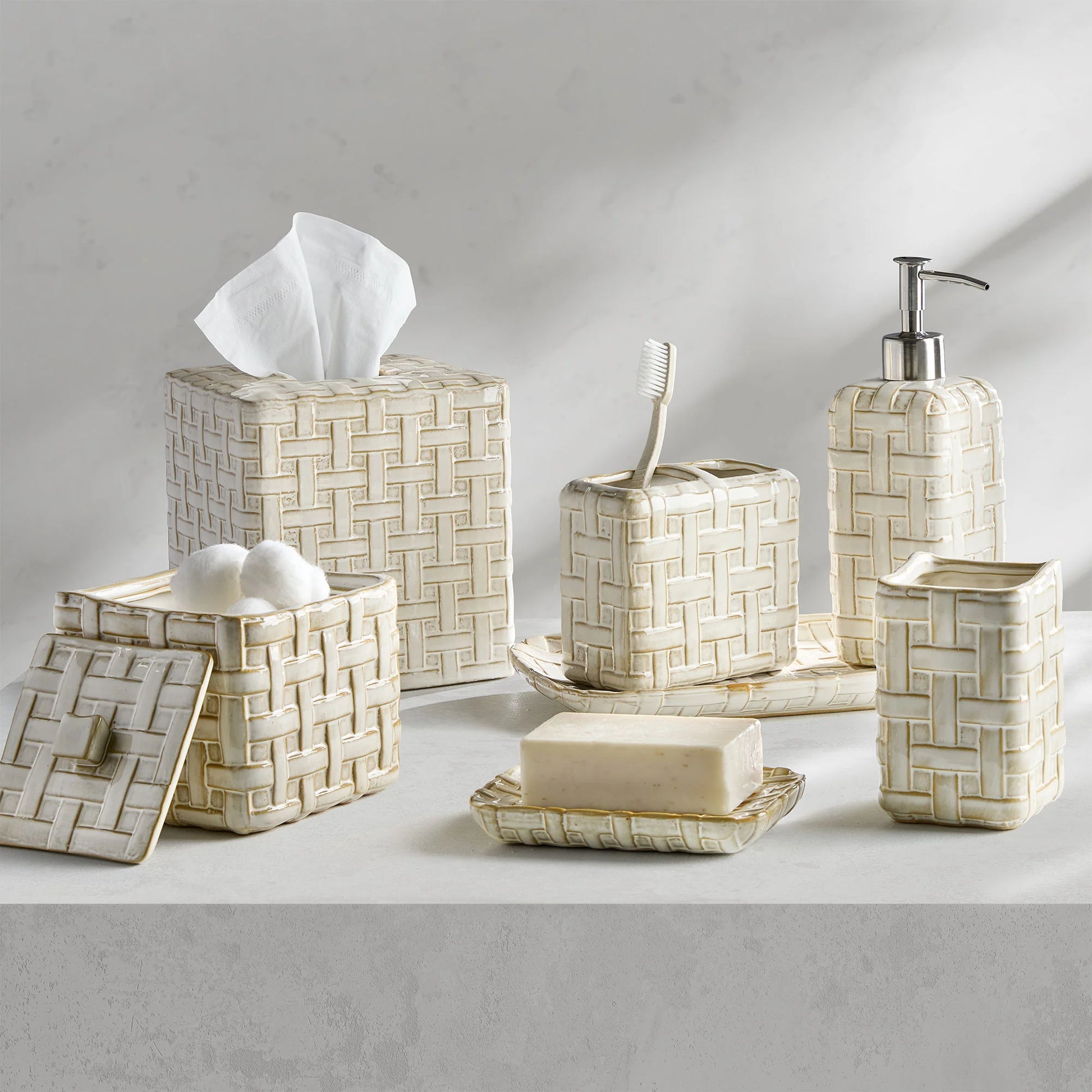 Made from embossed porcelain to evoke intricately woven raffia baskets, this accessory set adds a feeling of natural tranquility to the bath. Each cream-colored accessory features ultra-thin golden-brown lines along the edges of each weave, adding depth to the design and accentuating the allover woven pattern. The soap dish and tray also feature this tawny-colored highlight along the top, adding definition to these collection pieces. Adding to the serene appeal, each item was designed with rounded edges. Not dishwasher safe.