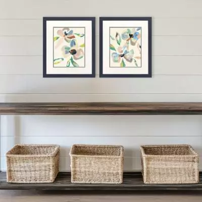 Fun flowers embrace the innocence of childhood with style. Matted in white and framed in a flat profile navy blue moulding with dark distressing.