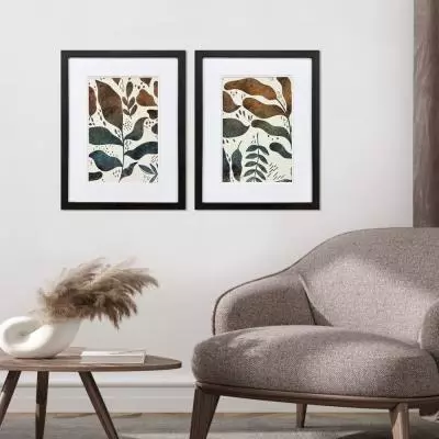 Autumn leaves in blue and rust colors are double matted in white. They are framed in a flat profile moulding in a dark espresso wood finish.