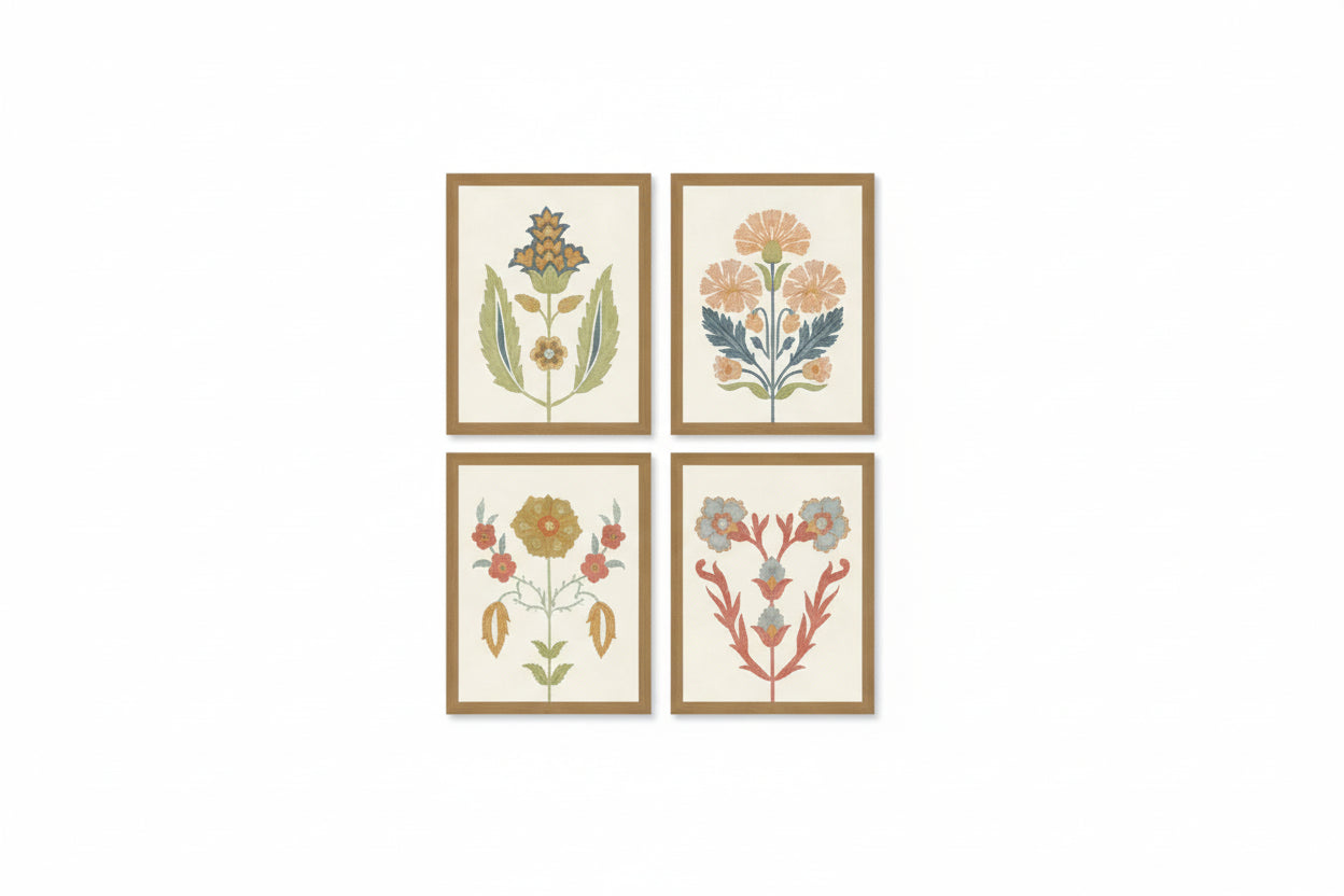 Folk art flowers have a vintage feel with cheery colors. Framed in a ribbed moulding in distressed gold.