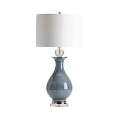 Francis Table Lamp features an elegant blue finish with subtle speckled designs. The shapely body of this lamp is crafted of ceramic. A crystal base and decorative crystal ball at the top complement the glossy finish and silver hardware