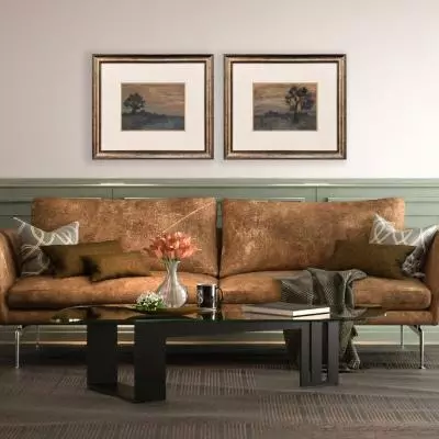 Solitary trees watch over an evening landscape. Matted in cream and framed in a scoop profile antique gold finish moulding with dark highlights.