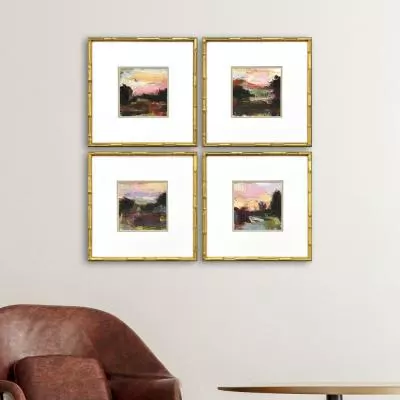 Rich colors mark a series of abstract landscapes. Matted in white and framed in an antique gold finish wood with bamboo pattern embossing.
