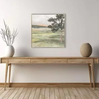 A quiet landscape features a hand applied enhanced gel finish overlay. Dimensionally framed in a champagne gold finish moulding with a dark wash.