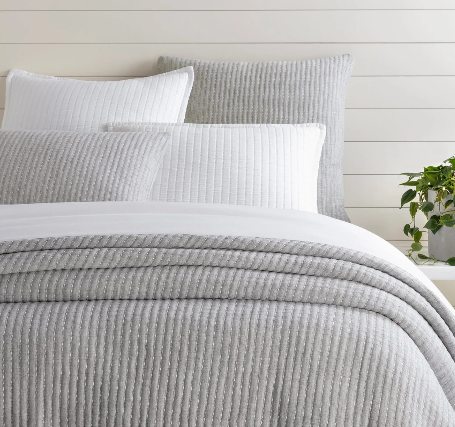 Precisely crafted parallel lines of white pick stitches make a graphic juncture with the black matelassé weave. This lofty, lightweight all-cotton coverlet is meticulously woven to have pockets of warmth that deliver extra nighttime insulation. An all-season essential to layer on the bed as needed. Reverses to same look and feel as the front.