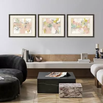 Captivating pink abstracts are a win with linen-look ivory matting. Framed in a mottled bronze moulding with an inward bevel and gold detailing.