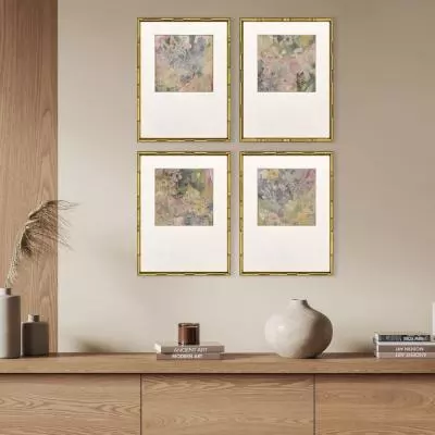 Abstract flowers are hand finished with a gel coating. Off-set cream matting and an antique gold wood frame with bamboo embossing completes the look.